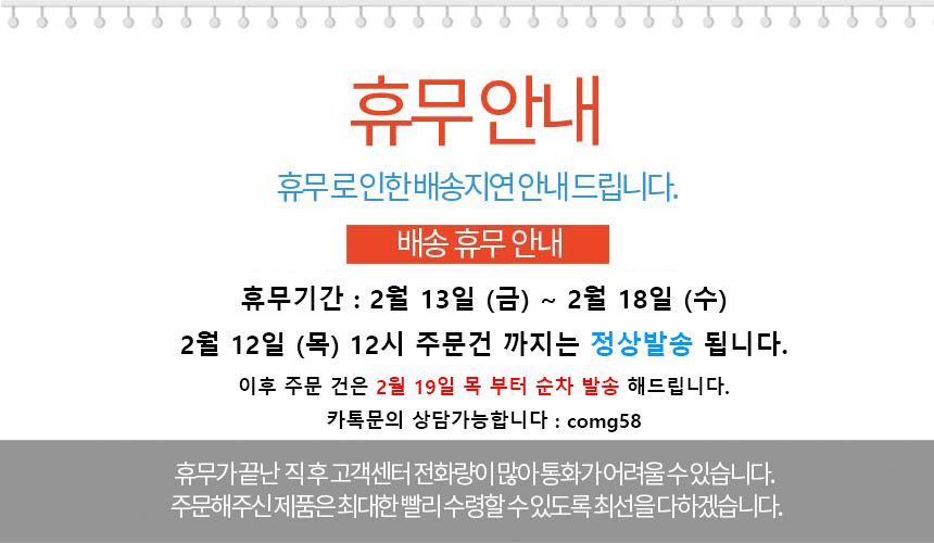 배송 기간 : 입금완료일로 부터 1~3일이내 배송됩니다.
